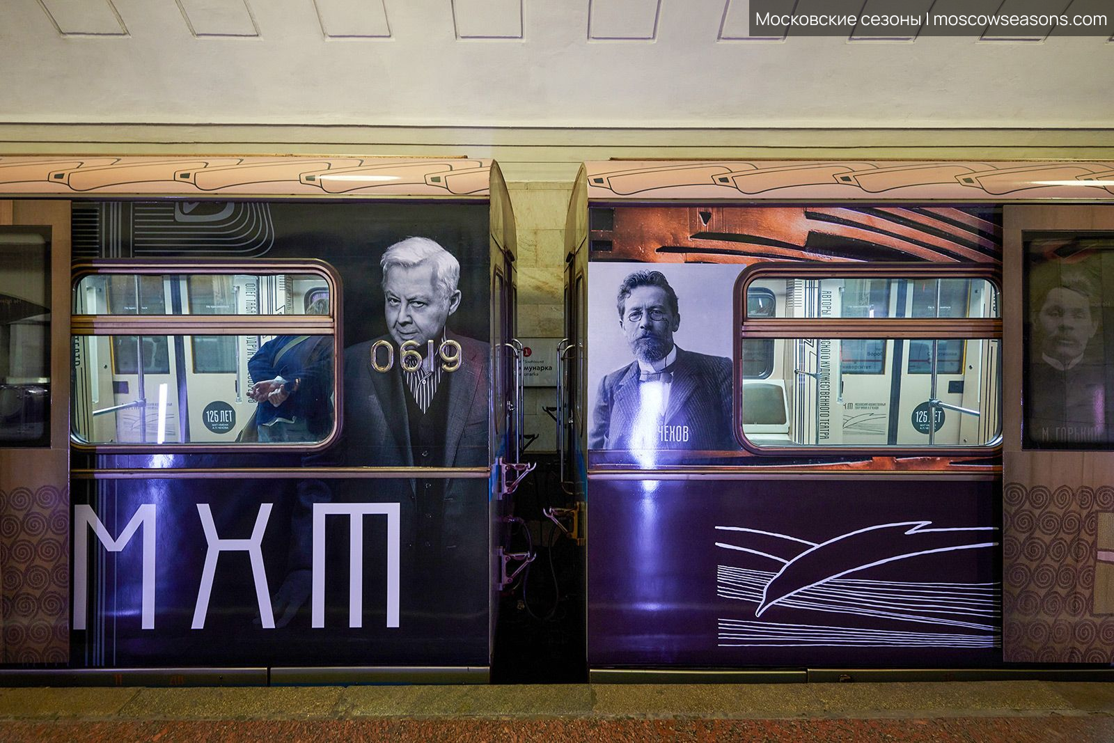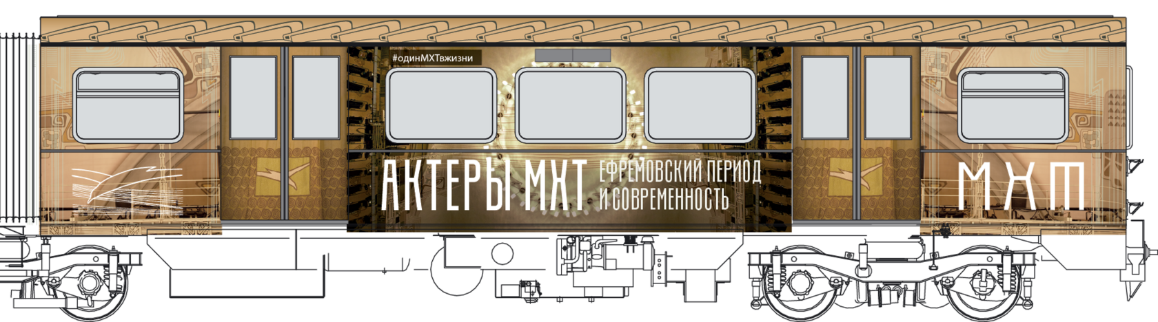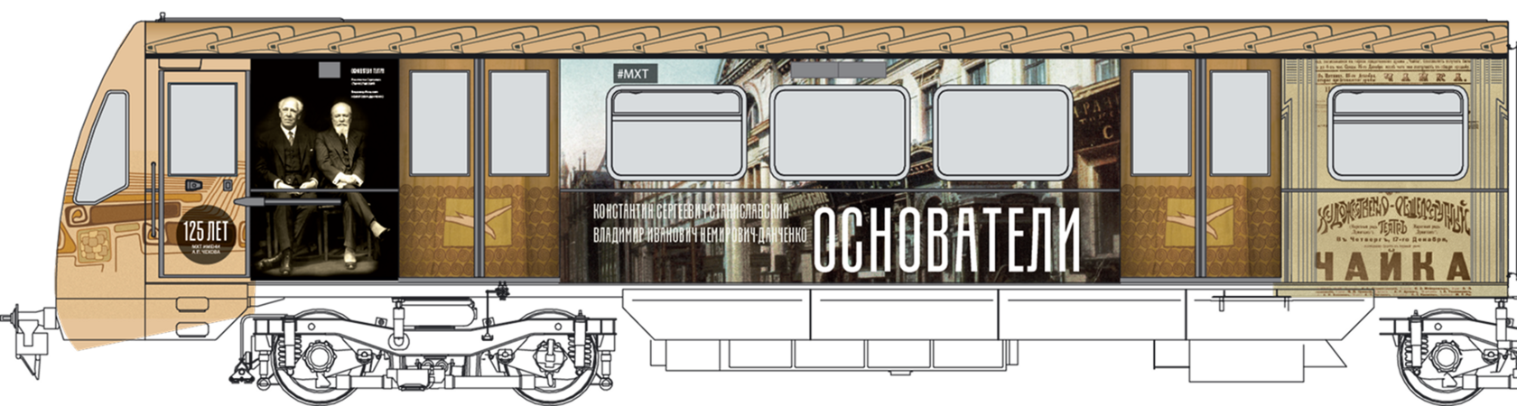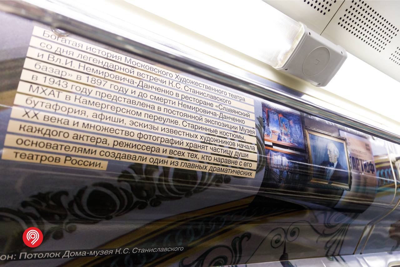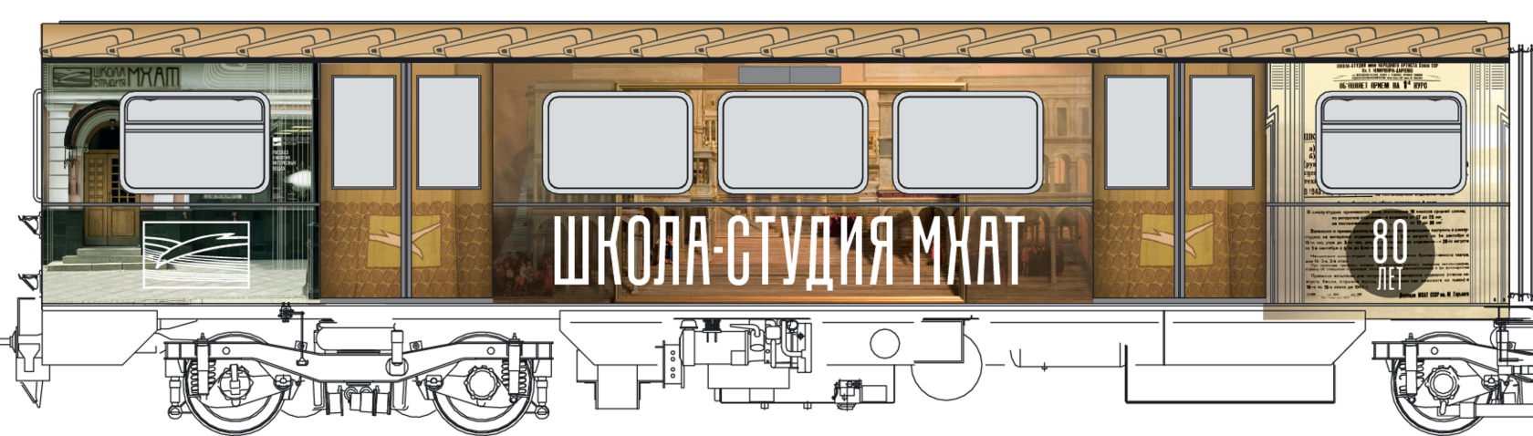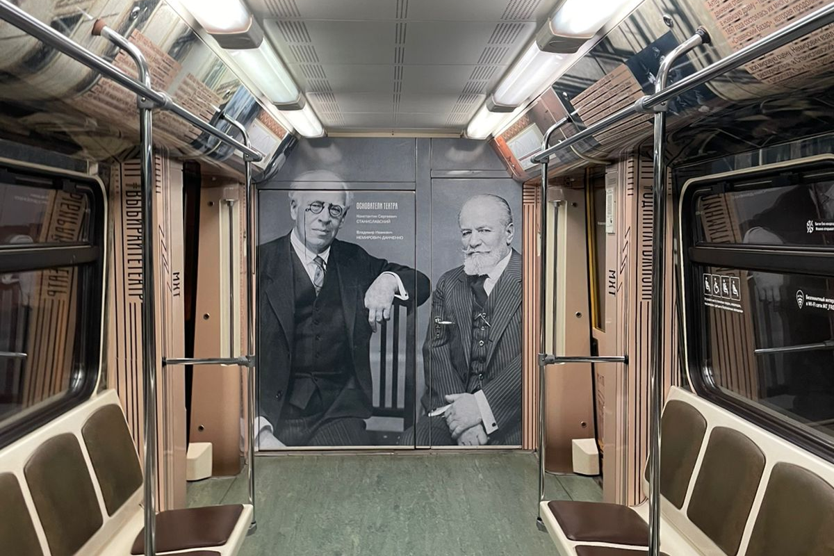 Мы построили визуальную систему, основанную на архитектуре здания МХАТ, созданного Шехтелем. На дверях вагонов появился символический занавес с чайкой. Визуальный язык сочетает архивные афиши, редкие фотографии, эскизы костюмов и современные образы, создавая живую связь прошлого и настоящего.