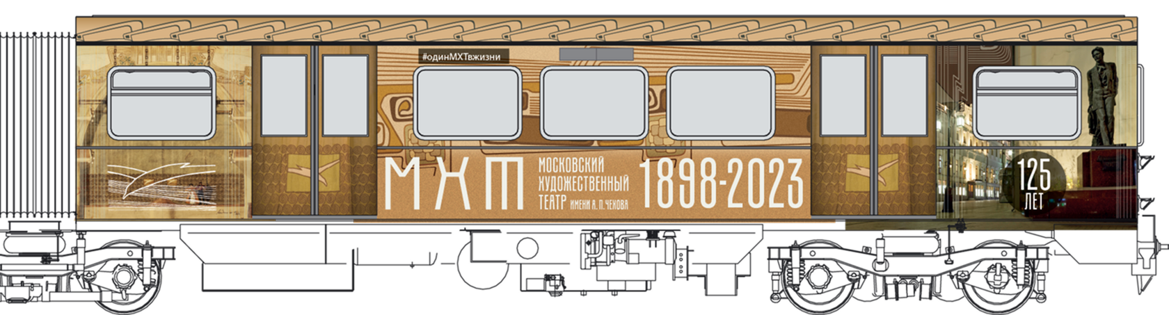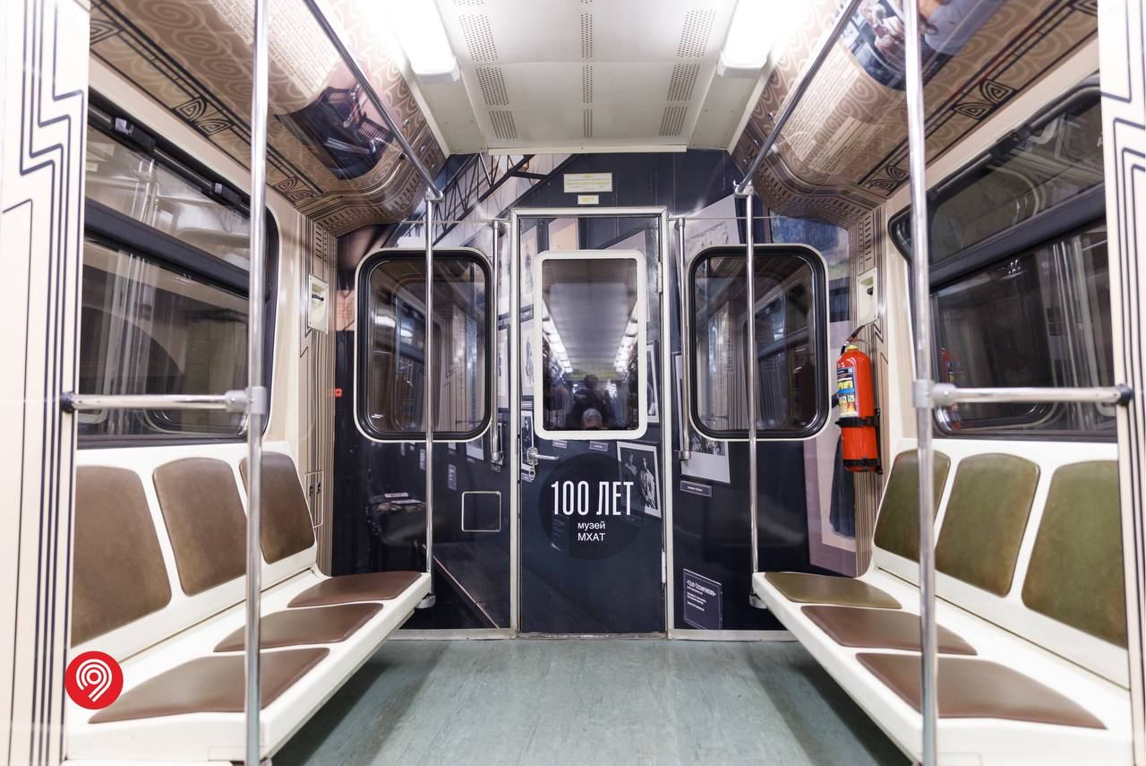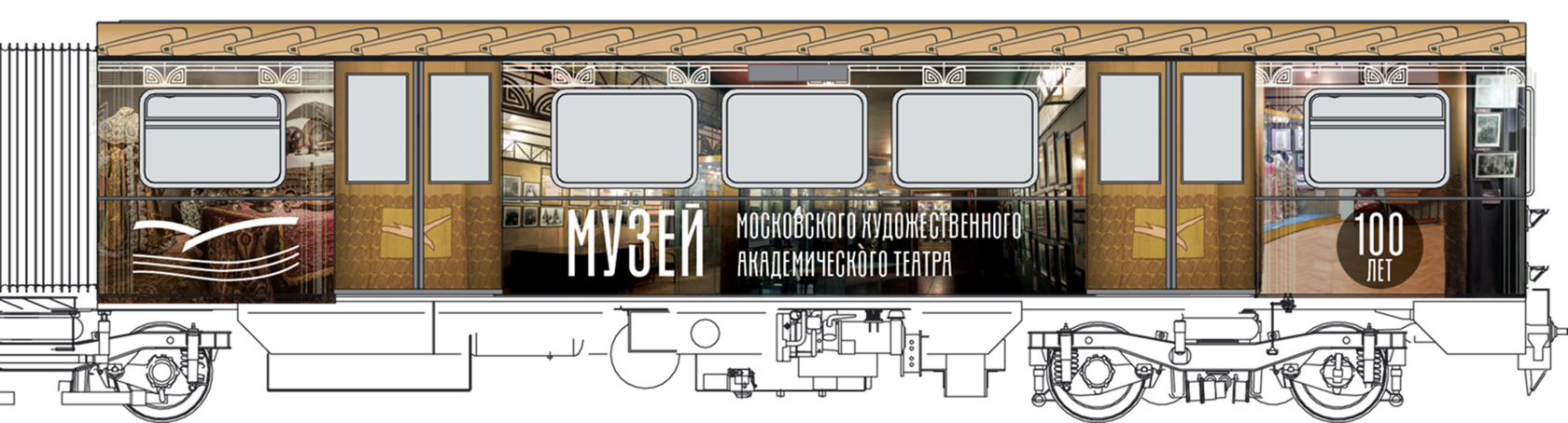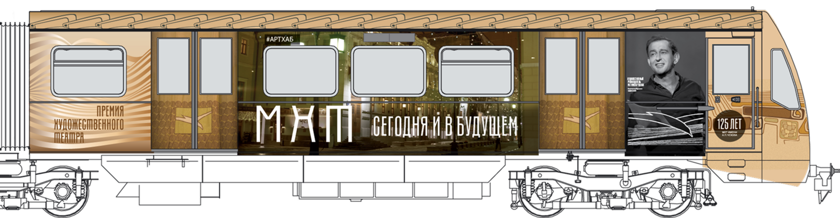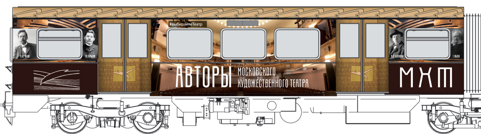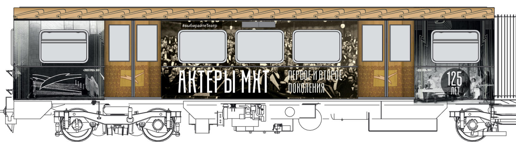 Мы построили визуальную систему, основанную на архитектуре здания МХАТ, созданного Шехтелем. На дверях вагонов появился символический занавес с чайкой. Визуальный язык сочетает архивные афиши, редкие фотографии, эскизы костюмов и современные образы, создавая живую связь прошлого и настоящего.