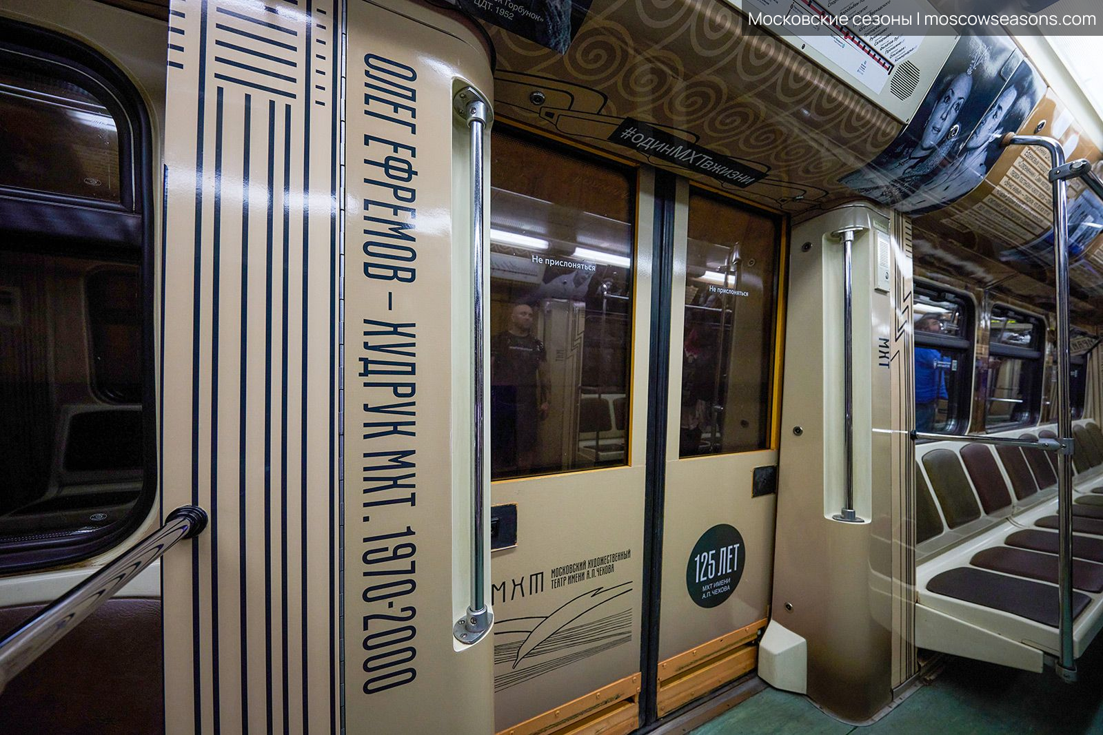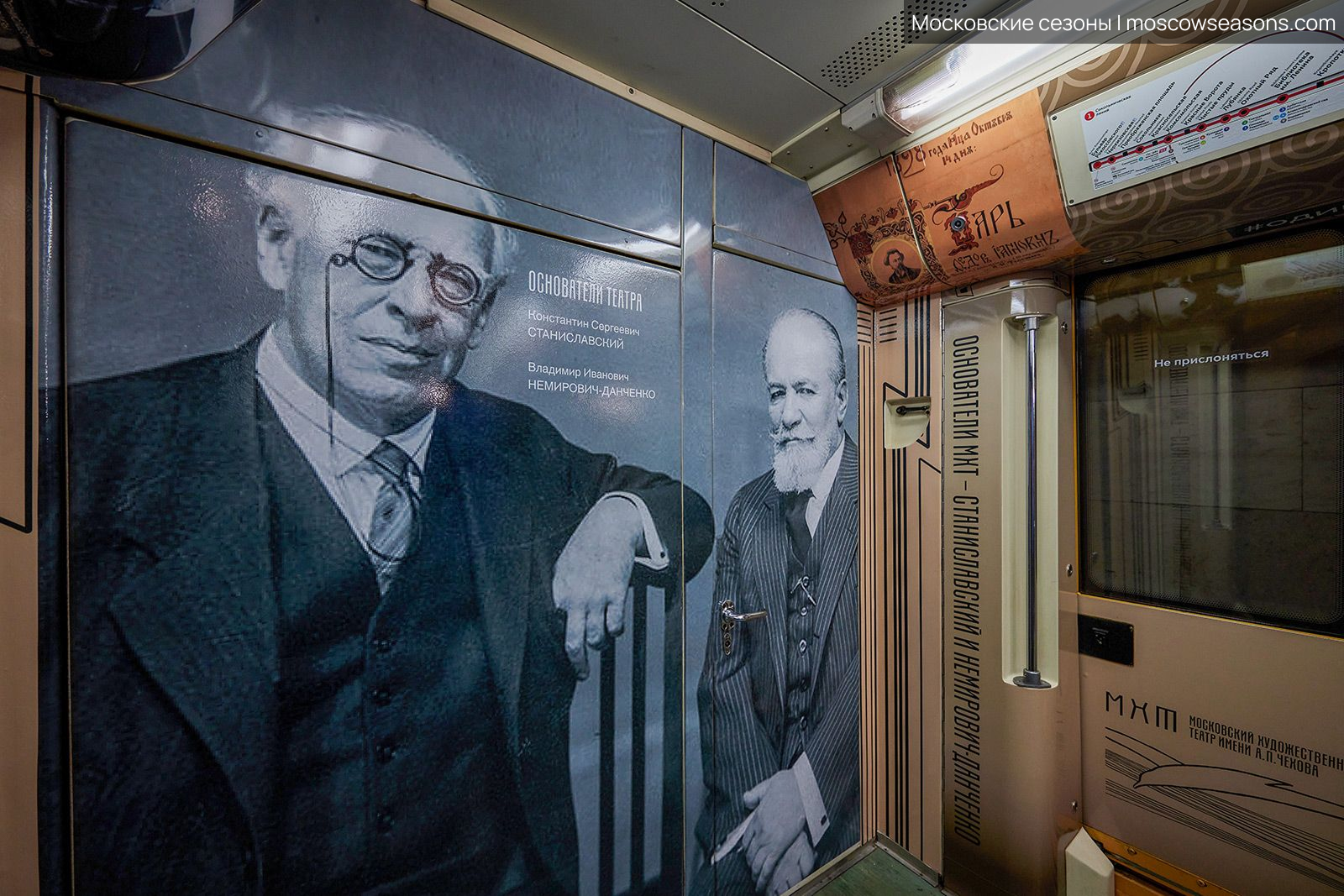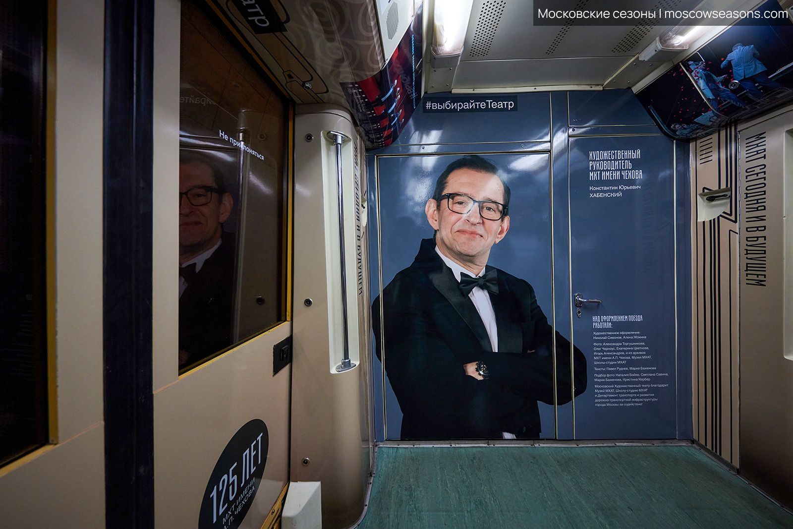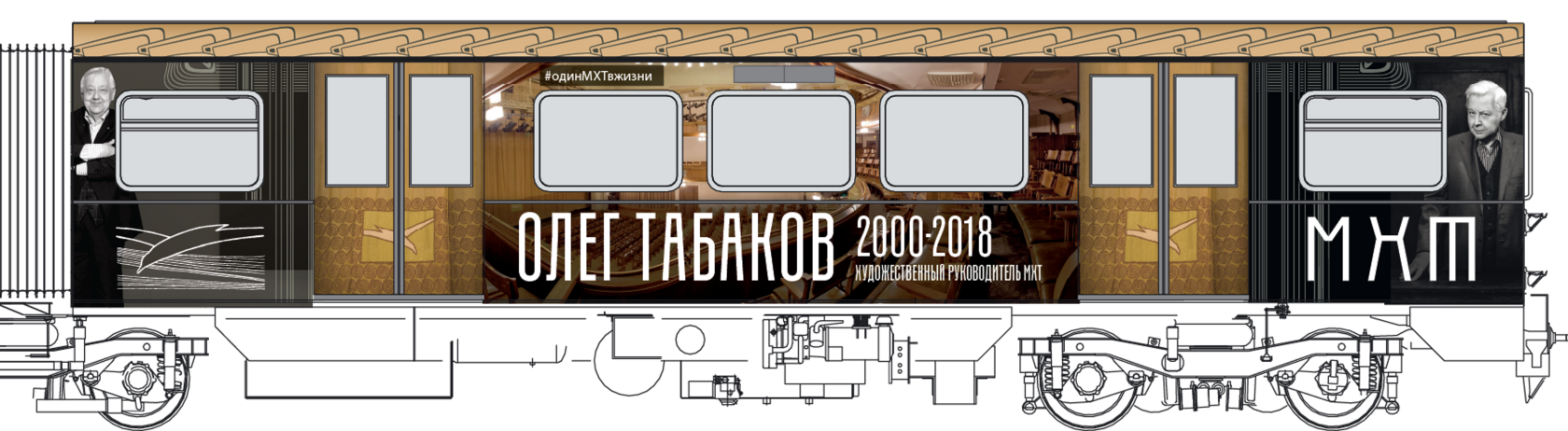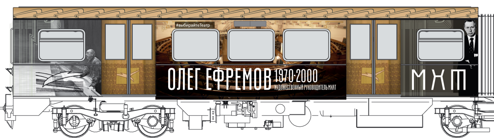 Мы построили визуальную систему, основанную на архитектуре здания МХАТ, созданного Шехтелем. На дверях вагонов появился символический занавес с чайкой. Визуальный язык сочетает архивные афиши, редкие фотографии, эскизы костюмов и современные образы, создавая живую связь прошлого и настоящего.
