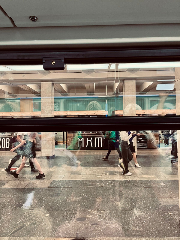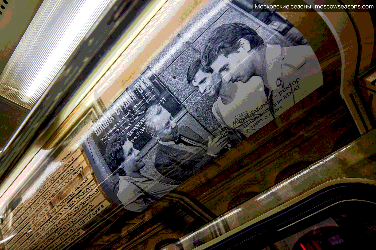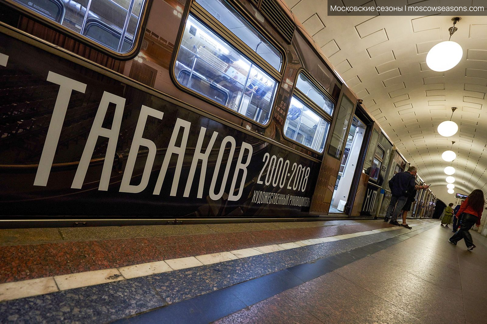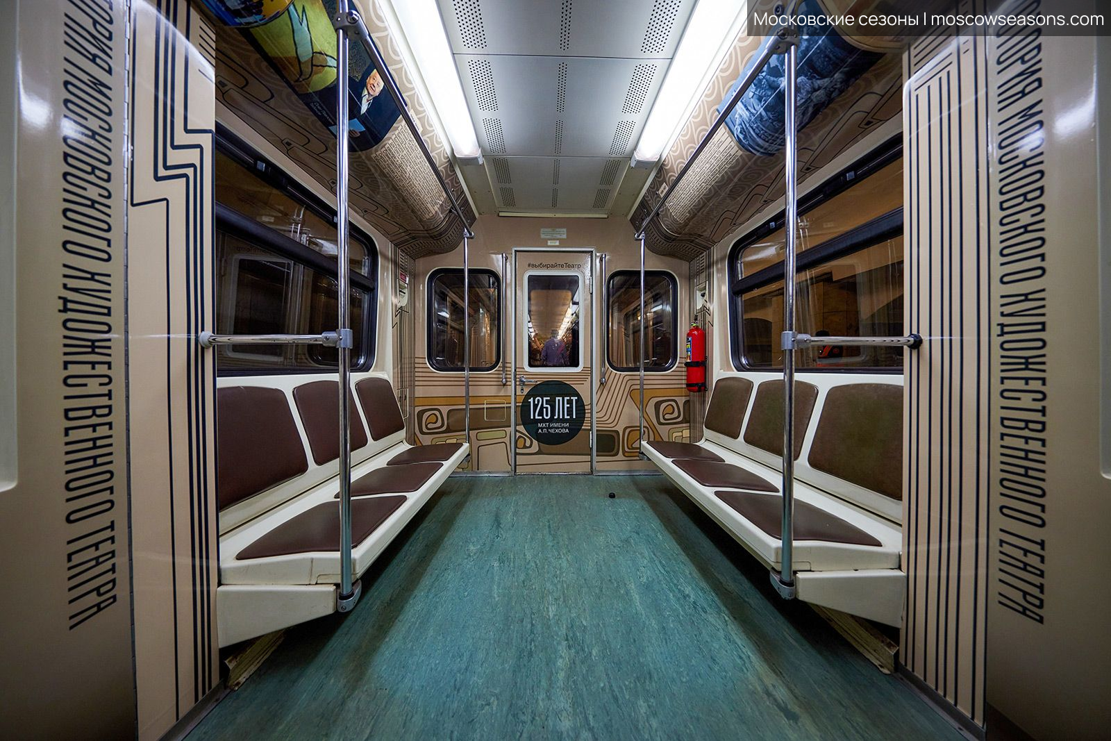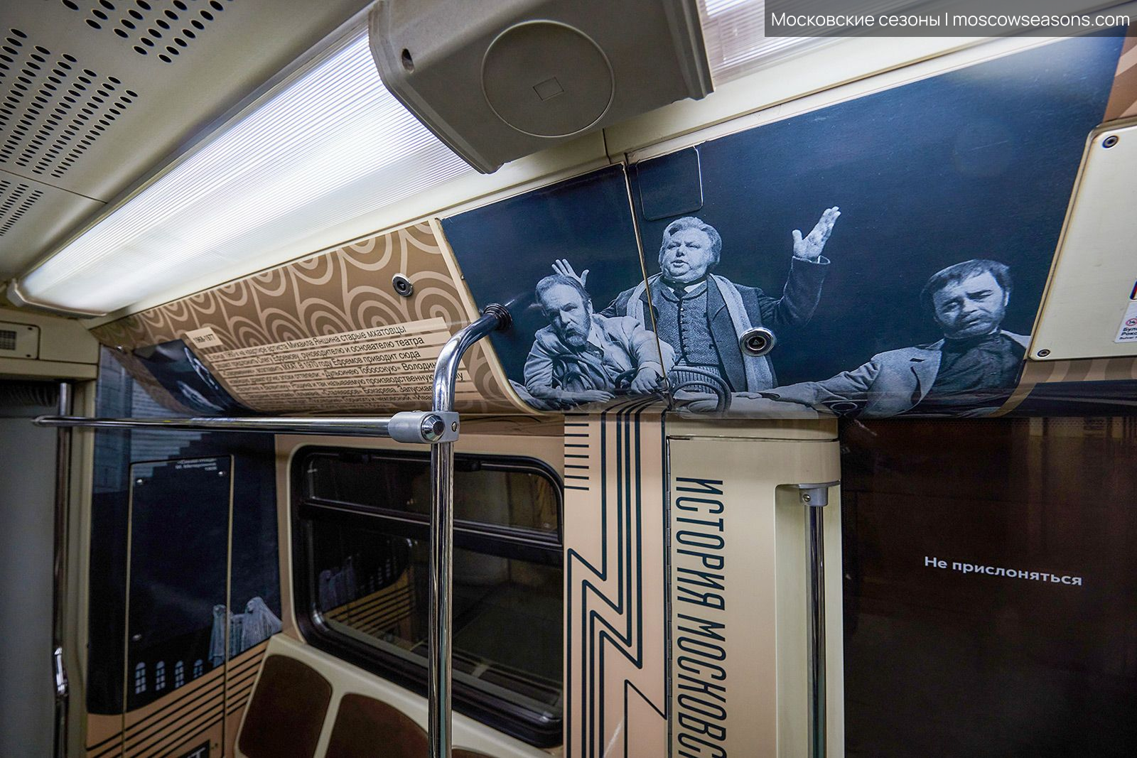 Мы построили визуальную систему, основанную на архитектуре здания МХАТ, созданного Шехтелем. На дверях вагонов появился символический занавес с чайкой. Визуальный язык сочетает архивные афиши, редкие фотографии, эскизы костюмов и современные образы, создавая живую связь прошлого и настоящего.